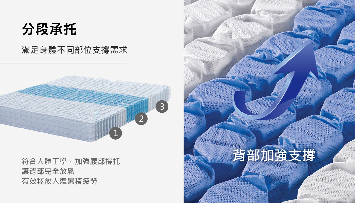 2.4mm/2.0mm三段式獨立筒,局部加強承托,以人體工學為基準,於頭、腰背、腿部分給予不同變化支撐,讓背部脊椎完全放鬆。