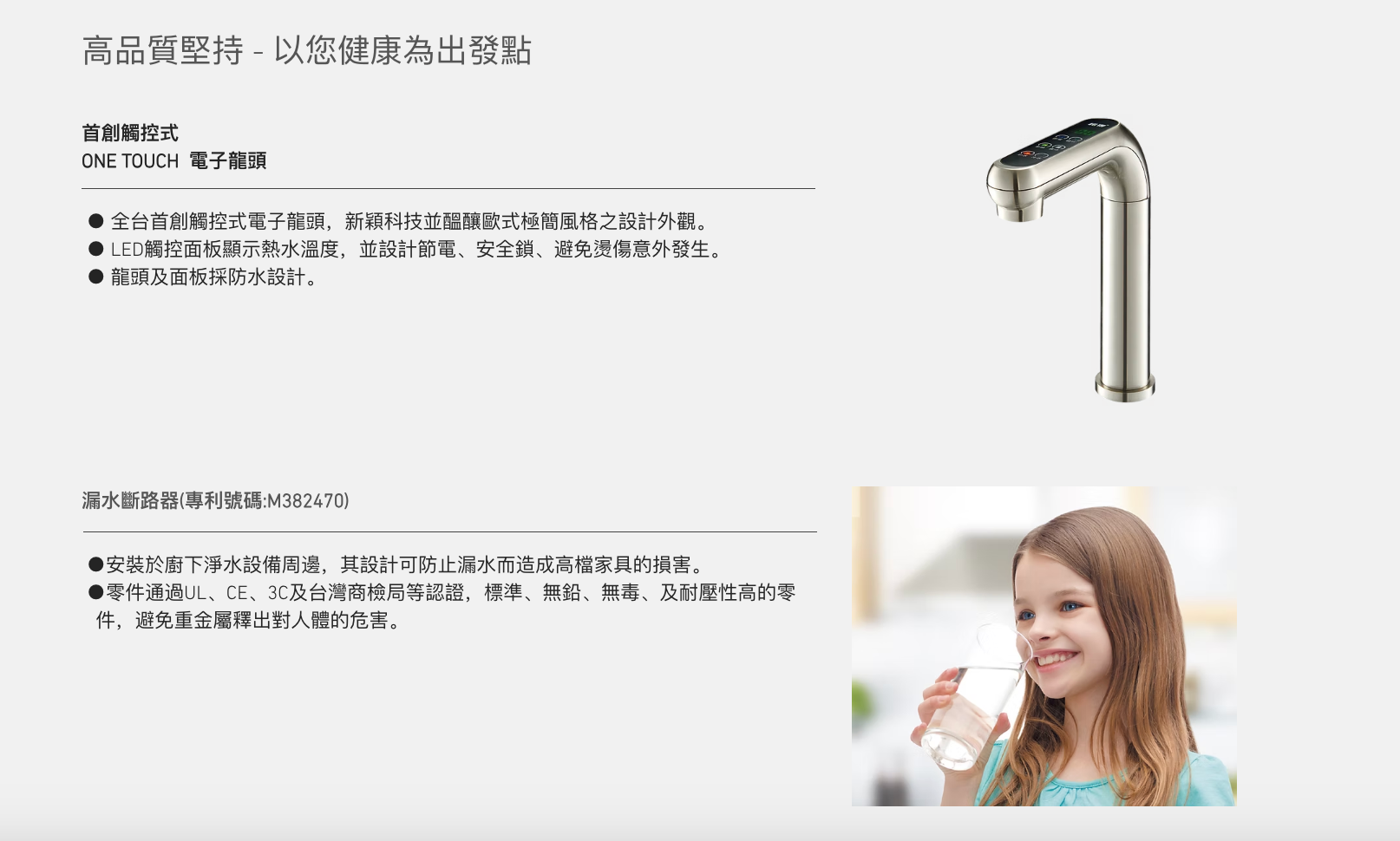 ➤首創ONE TOUTCH觸控式龍頭,面板防水設計,新穎科技兼具美觀及耐用