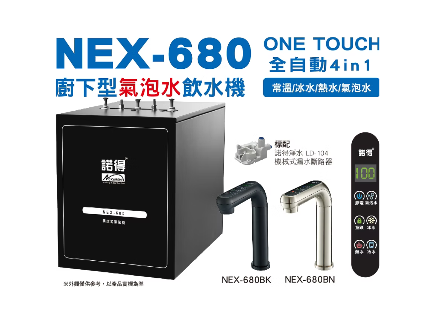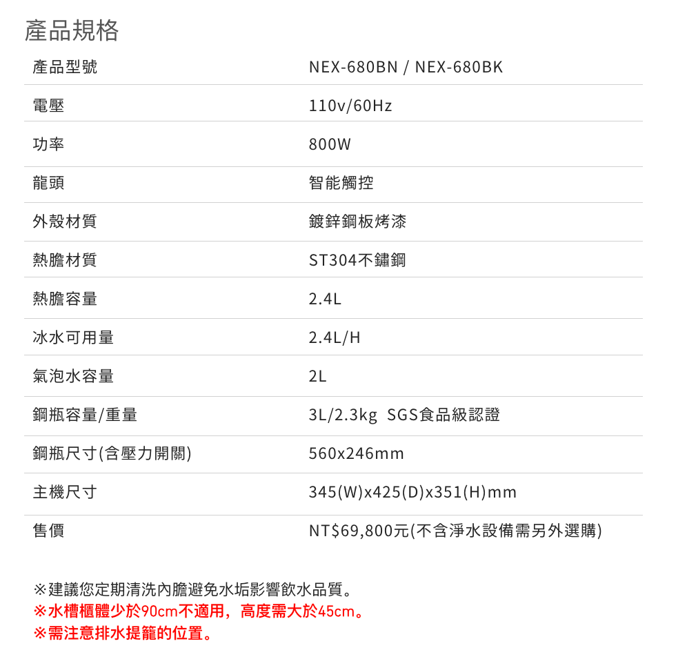 產品特色‧專屬龍頭搭配設計,四種飲用水模式選擇冰/溫/熱/氣泡水‧搭配符合食品等級氣泡鋼瓶,隨時享有新鮮健康的氣泡水‧LED觸控面板顯示熱水溫度,設計節電、安全鎖避免燙傷意外‧龍頭及面板採防水設計,符合標準無鉛無毒,保障飲水安全(不含淨水設備需另外選購)