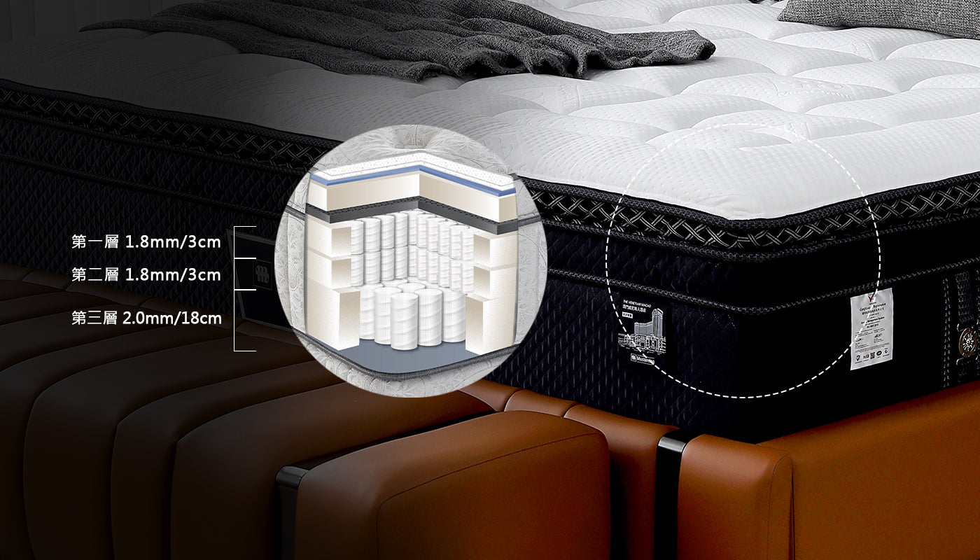 精心研發「獨立筒減壓結構」,第一層1.8mm/3cm、第二層1.8mm/3cm、第三層2.0mm/18cm獨立筒,根據賽車避震抗壓原理設計,不僅完美釋壓,更可降低干擾,使睡感Q彈有層次、完美釋壓,幫助進入深層睡眠狀態,徹底休憩恢復精神活力。