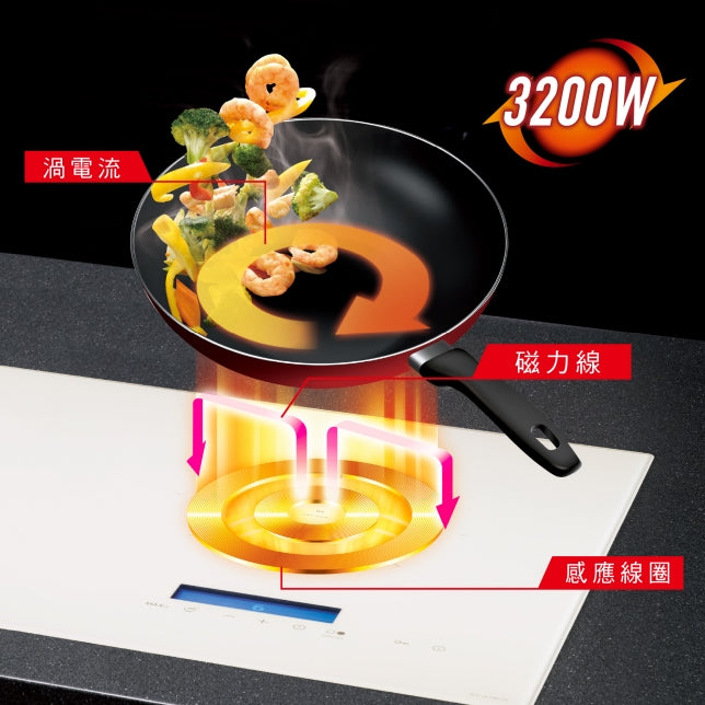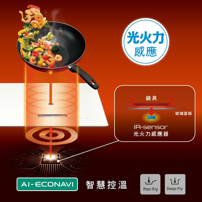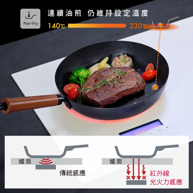 光火力感應/油煎:穿透爐面直接偵測鍋底溫度,加熱快控溫更精準。