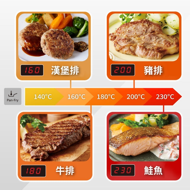 針對不同食物設定合適的溫度,使菜餚油煎到最恰好的美味
