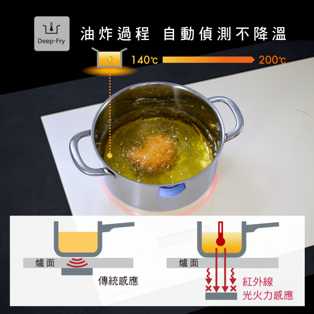 光火力感應/油炸:穿透爐面直接偵測鍋中油溫,控溫更精準。