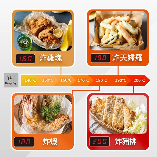 炸物美味的關鍵在油溫,一鍵設定合適溫度,炸物輕鬆製作!